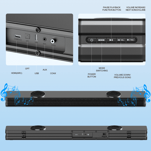 Immersive Performance & 3 EQ modes: Experience powerful, room-filling surround sound with 6 total speakers.You can fine adjust your soundbar with 3 different equalizer modes (Music, News, Movie) via the remote control to match your favorite sound.